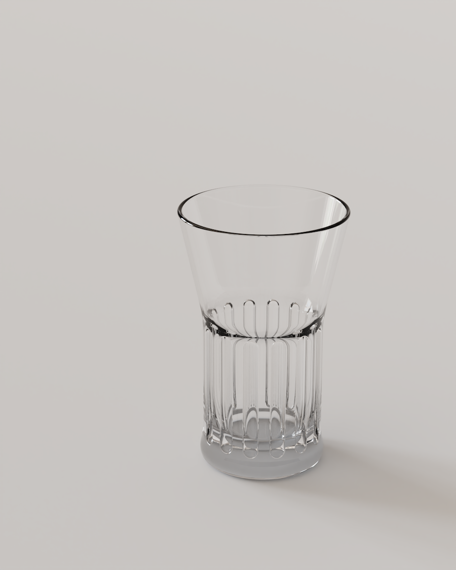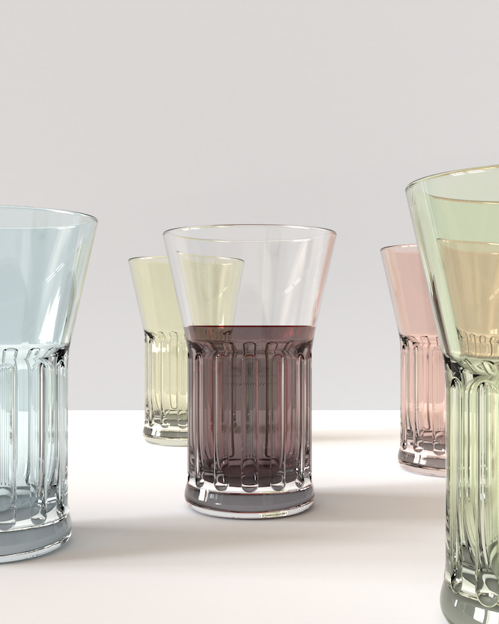 The CYGNEGLASS preserves the elegance of the original design while enhancing visual stability with a wider base, evoking the grace of a swan that maintains its position on the water by moving its feet. The significant difference between the upper and lower sections of the traditional drinking glass gives it a light and unstable appearance. By rethinking the lines and shapes, I added visual weight to the base while retaining the refined aesthetic. This glass is available in four light shades as well as a slightly tinted transparent version.