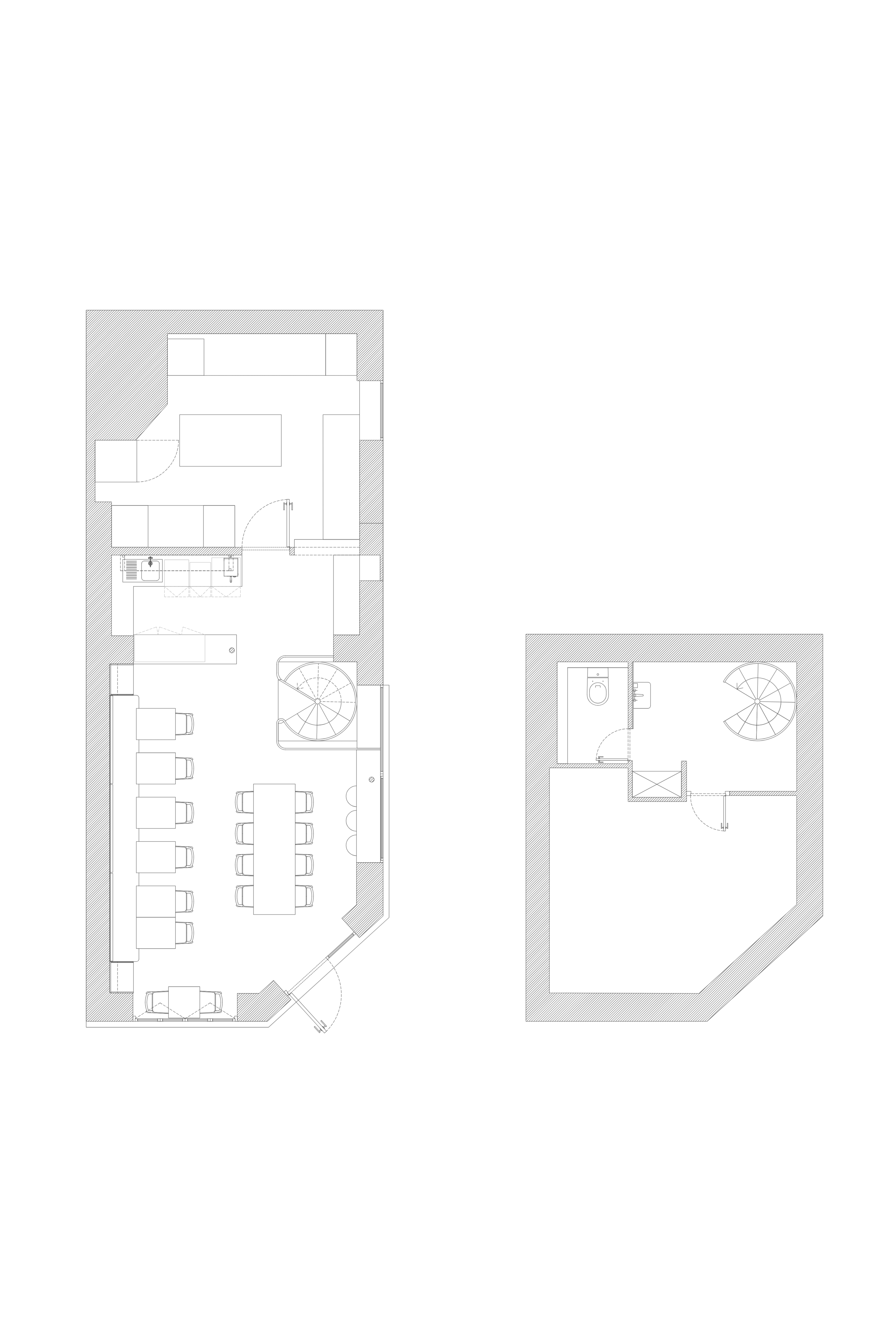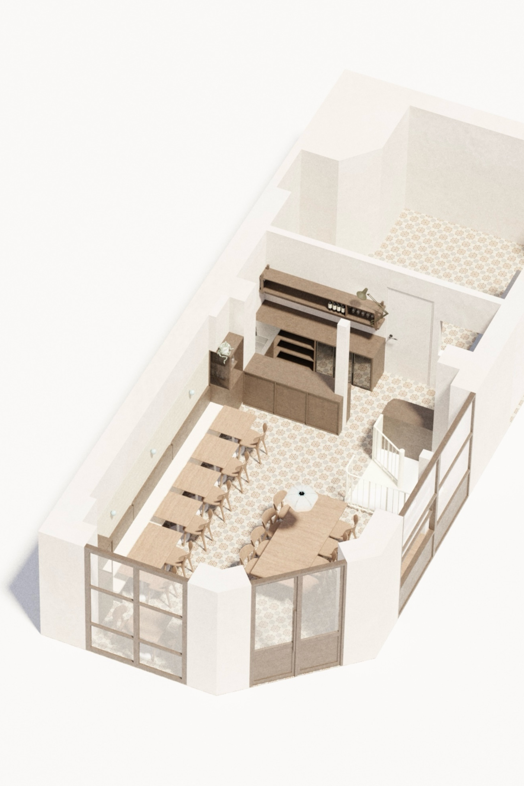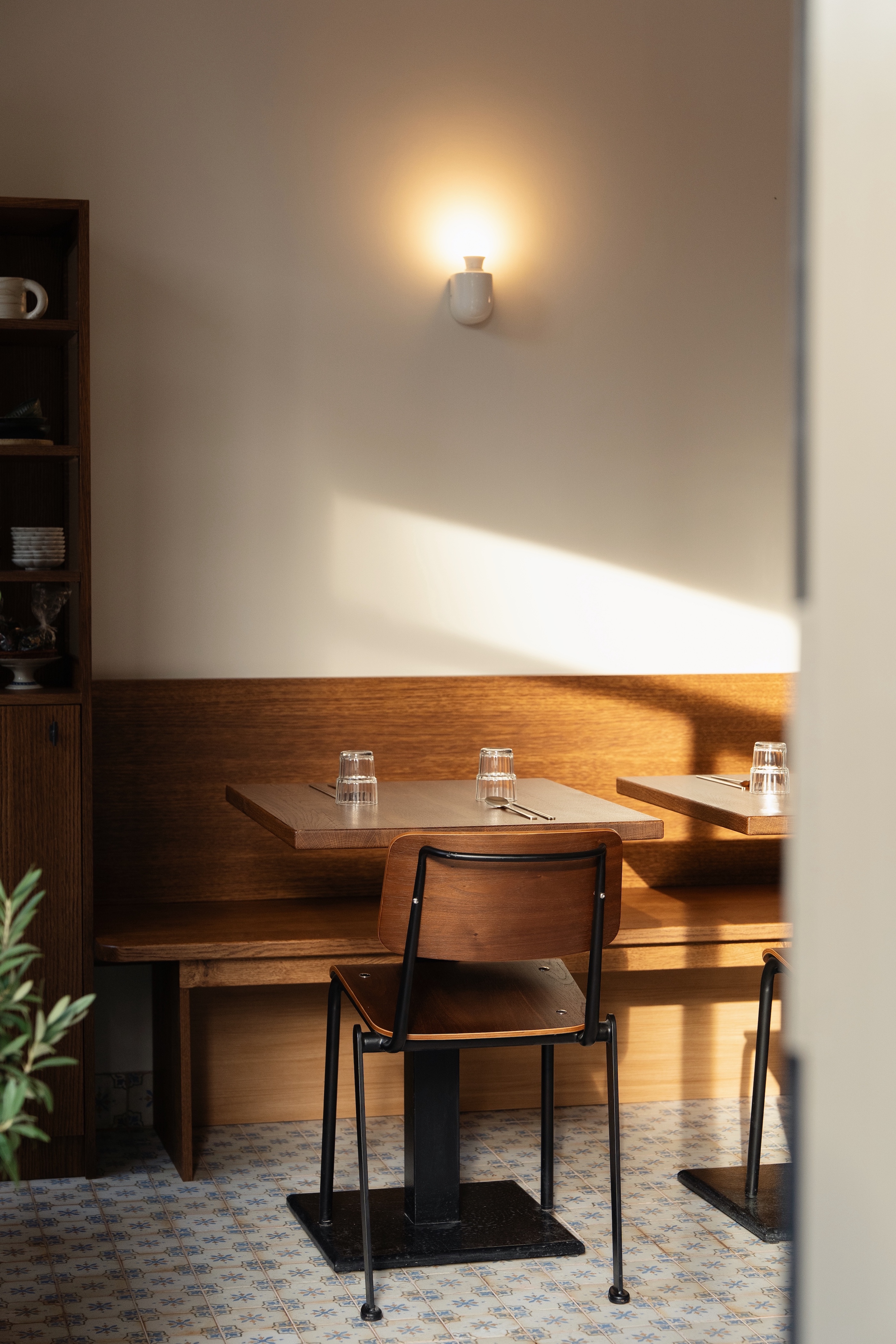 The storage furniture is divided into display areas for tableware used in the restaurant and functional storage designed to support service flow. Glass panels maintain visual openness while subtly concealing the contents. All tables and furniture were custom-designed to fit the space, with the central table featuring a different wood tone to create contrast and visual balance. The counter and kitchen layout were conceived holistically, with circulation, equipment placement, and storage carefully planned to optimize workflow.